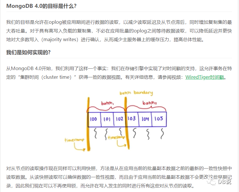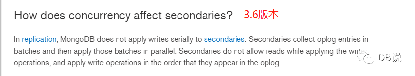 因为我们的聚合SQL对时效不是非常敏感,因为是多线程执行聚合,每一个线程按照部门等条件聚合的,有几百到几千部门,只是关注总时间,总执行时间在1分钟内(有的SQL都是毫秒级别),双11执行异常,分析具体慢SQL才发现很多主要等待在获取锁上,所以出现异常。查询官方文档以及mongodb官方博客,mongodb 4.0之前版本备库写会阻塞读,平时没有延迟所以备库阻塞读的时间非常短。