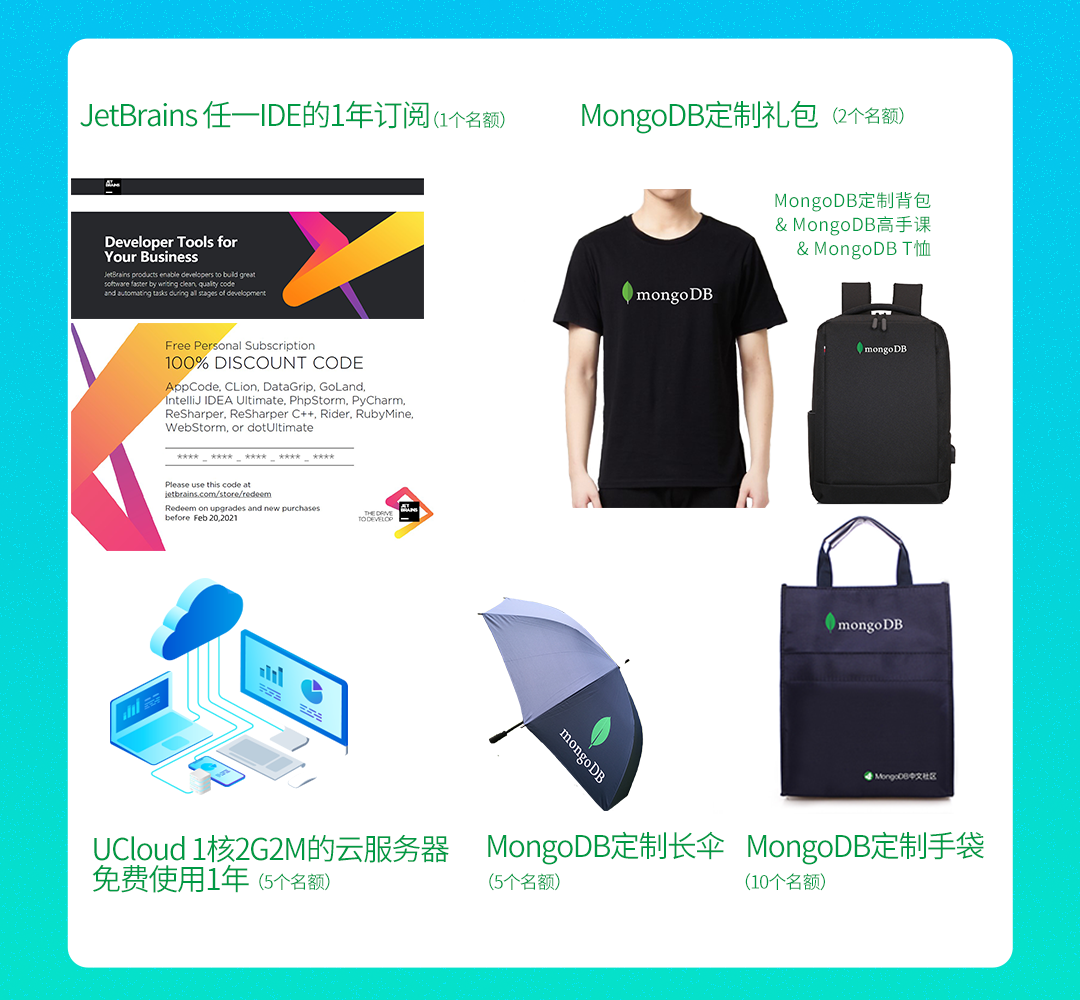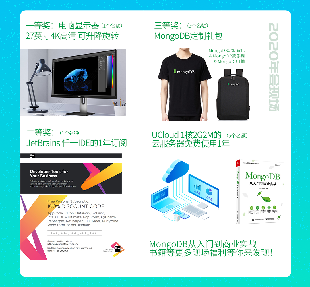 本次大会上下午休息期间均设有在线抽奖。想获得可升降旋转显示器?JetBrains 任一IDE1年免费订阅?MongoDB定制礼包?UCloud免费云服务器?现场还有《MongoDB从入门到商业实战》书籍等礼品!
